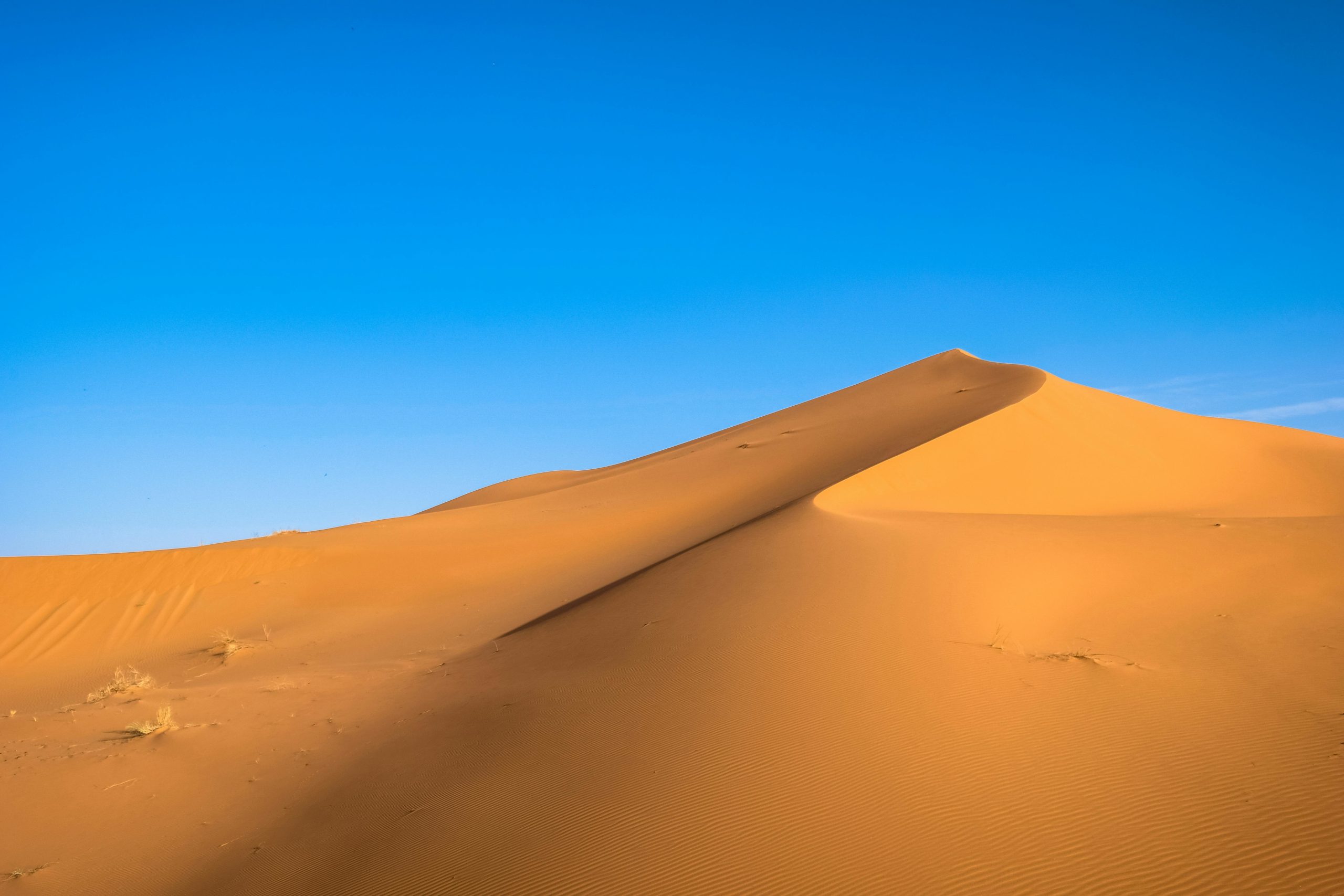 A Breathtaking View Of Golden Sand Dunes Contrasted Against A Vibrant Blue Sky In A Desert Landscape.