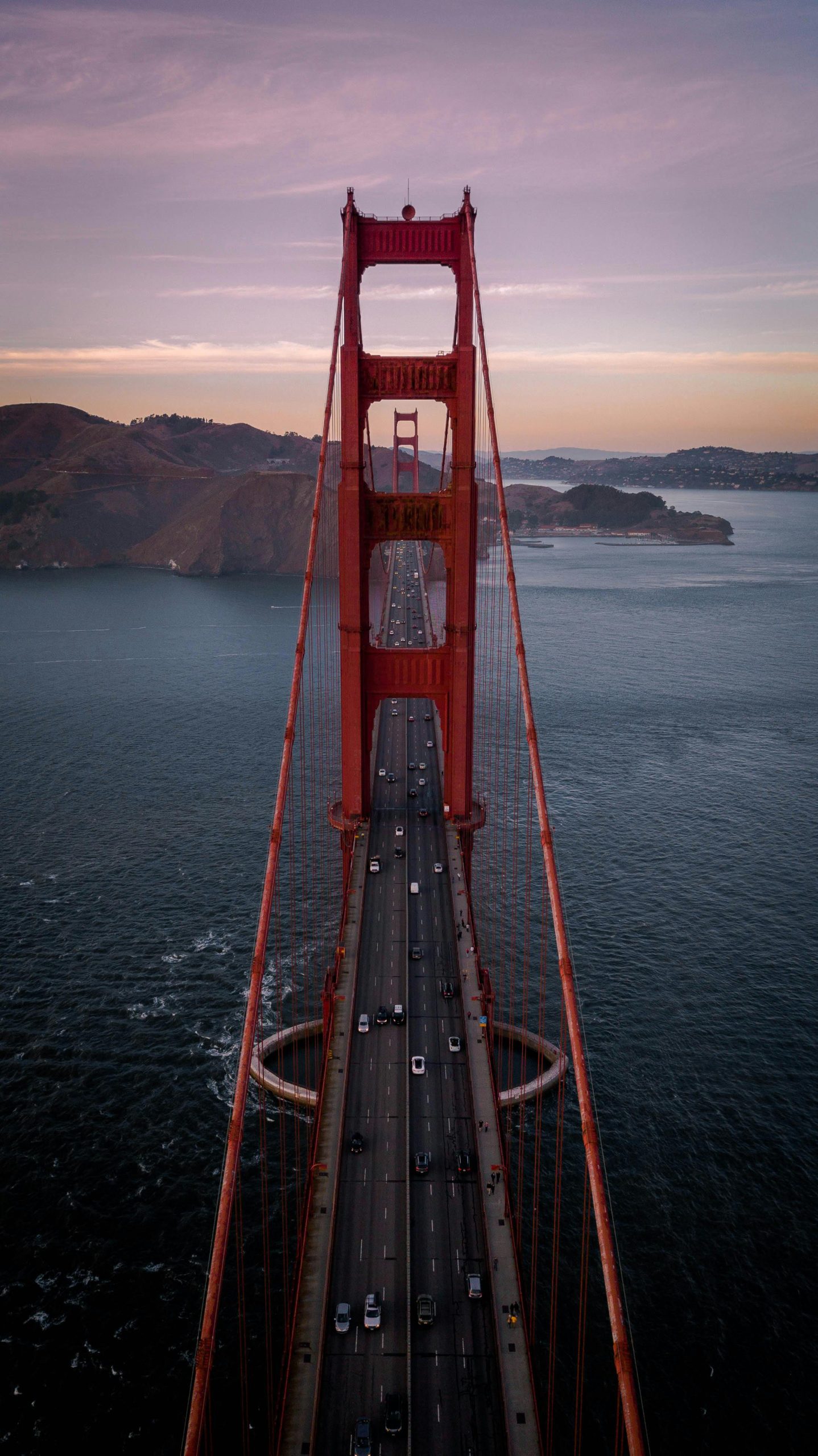 A Captivating Aerial View Of The Golden Gate Bridge At Twilight With Serene Ocean And Hills.