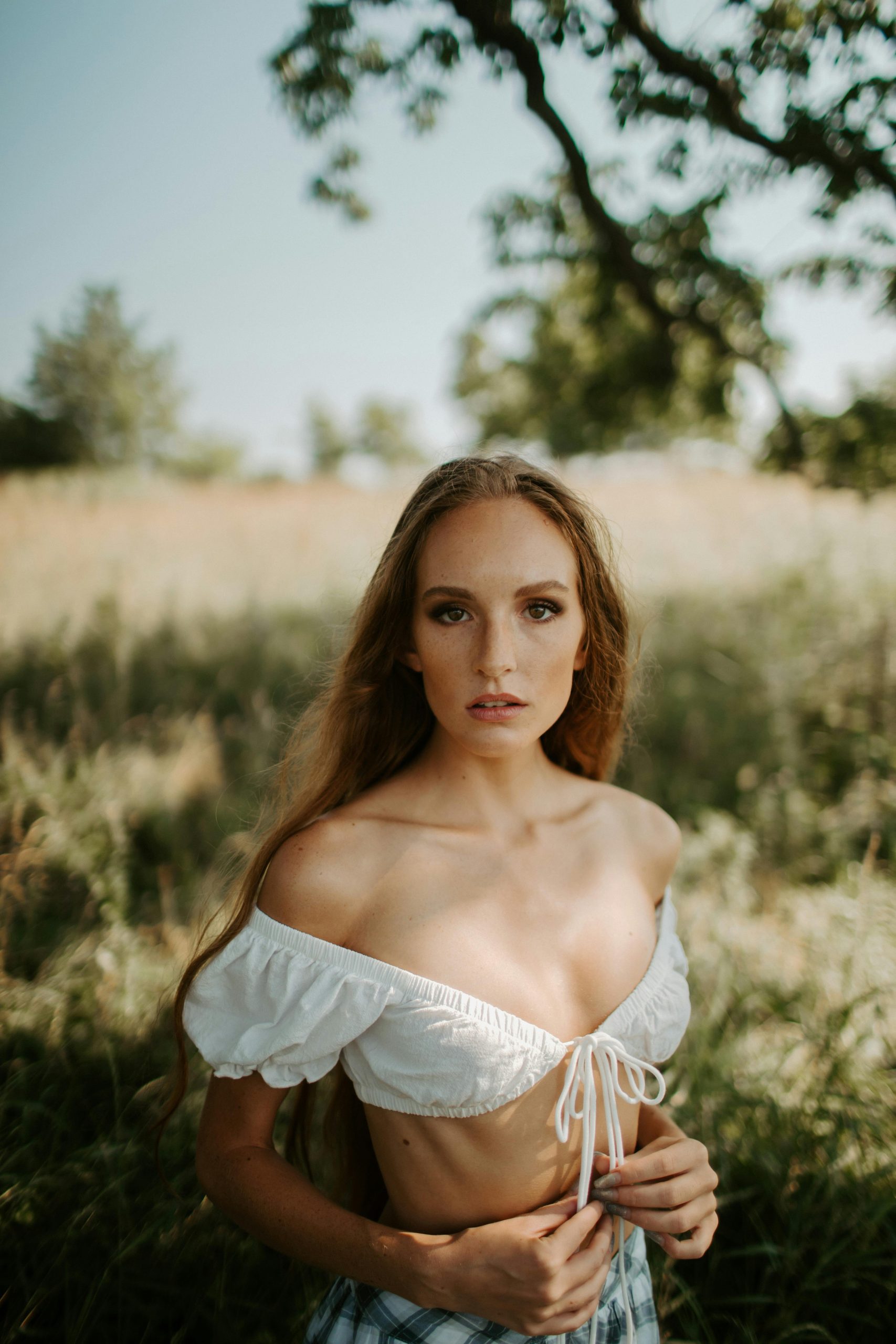 A Serene Portrait Of A Woman In A White Top In A Sunny Meadow, Exuding Natural Beauty.