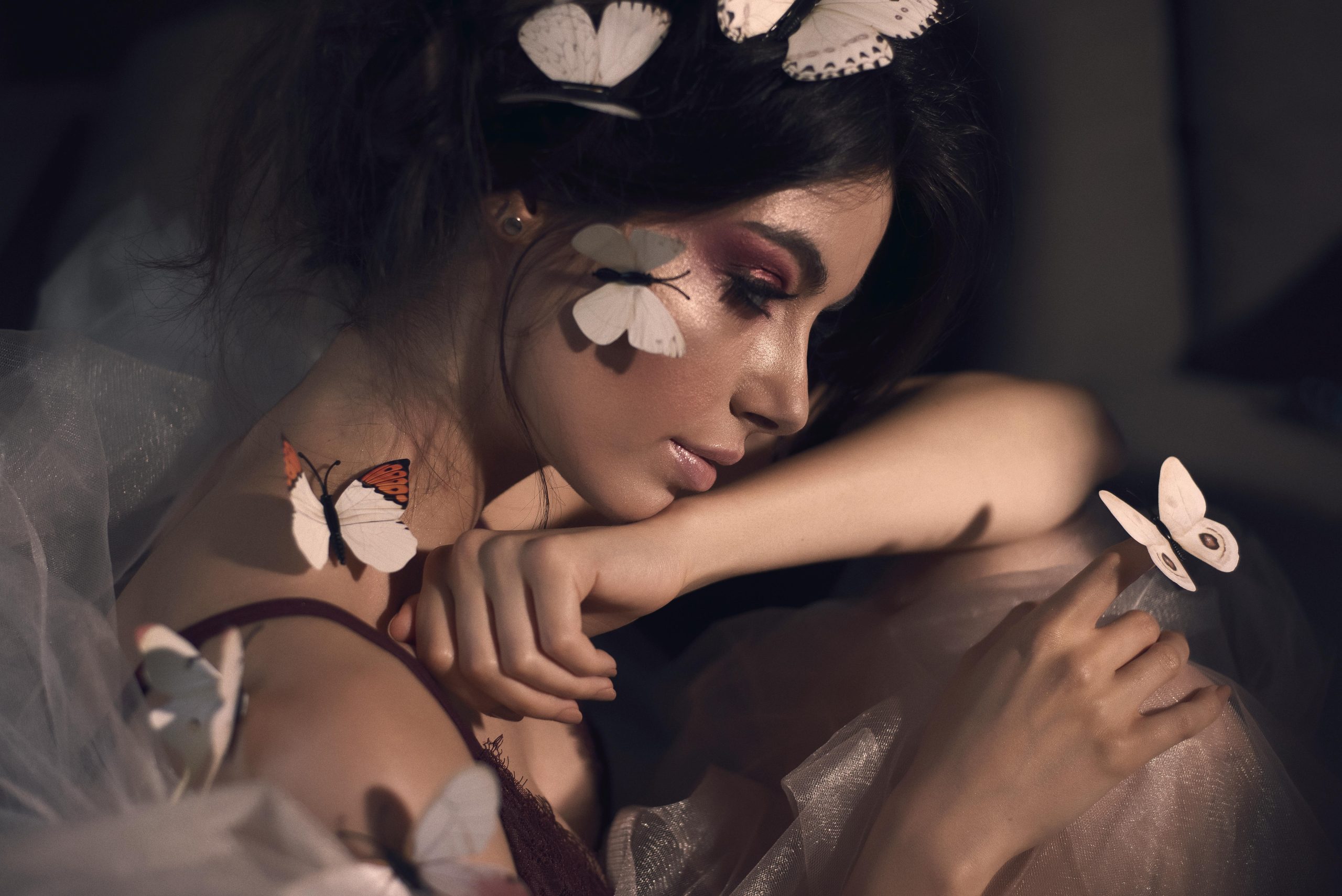 Artistic Portrait Of A Woman With Closed Eyes And Butterflies, Showcasing Elegance In A Studio Setting.