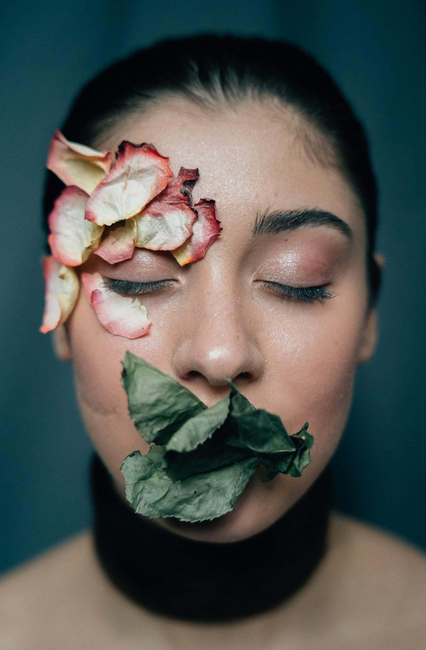 Artistic Portrait Of A Woman With Eyes Closed Adorned With Dried Petals And Leaves On Her Face.