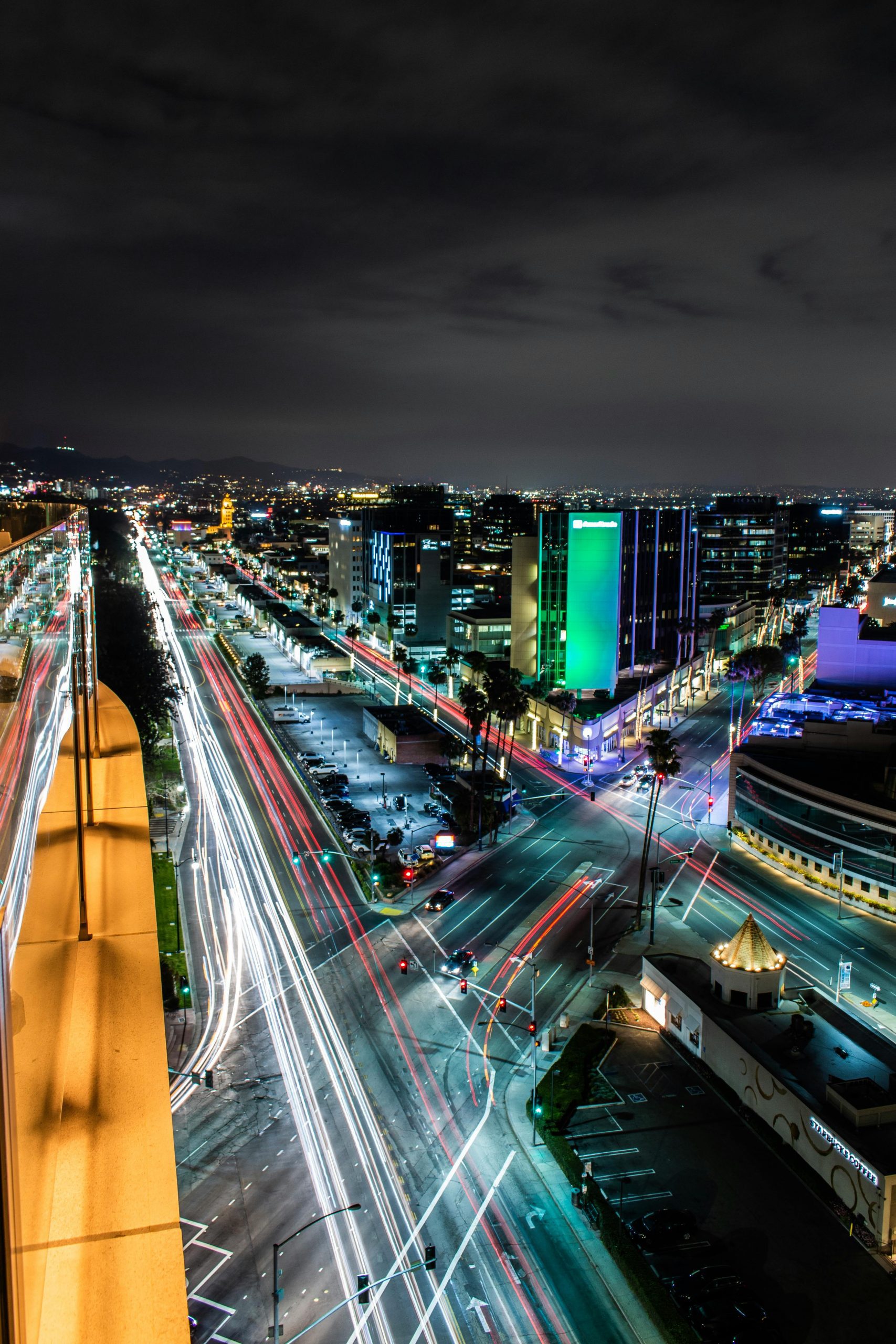Dramatic Nighttime Cityscape Of Beverly Hills Showcasing Vibrant Light Trails And Illuminated Buildings.