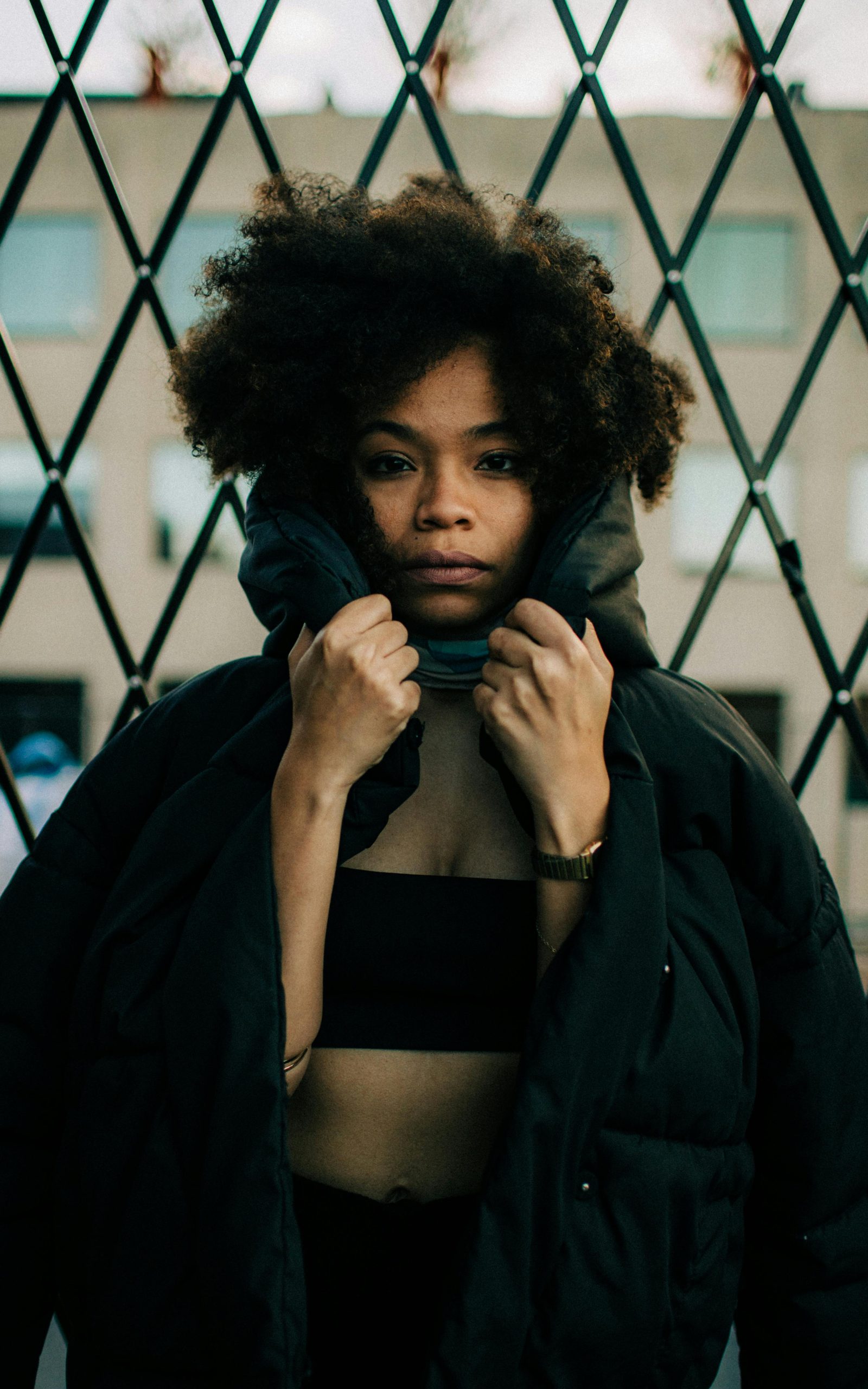 Be the first to review “Portrait Of A Fashionable Woman Posing In A Black Puffer Jacket Outdoors.”
